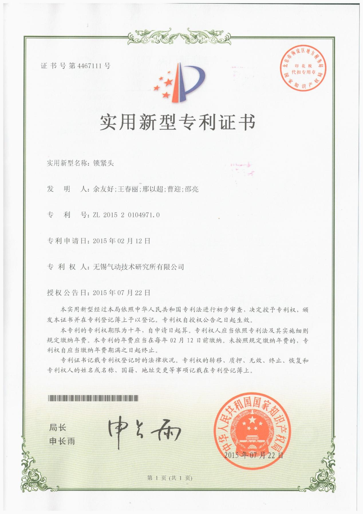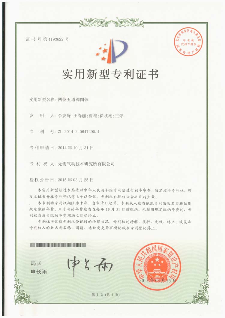 四位五通閥閥體專利證書