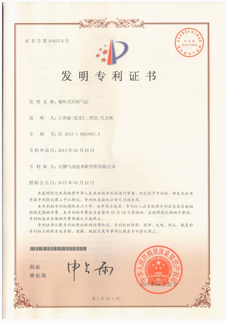 循環式回轉氣缸專利證書