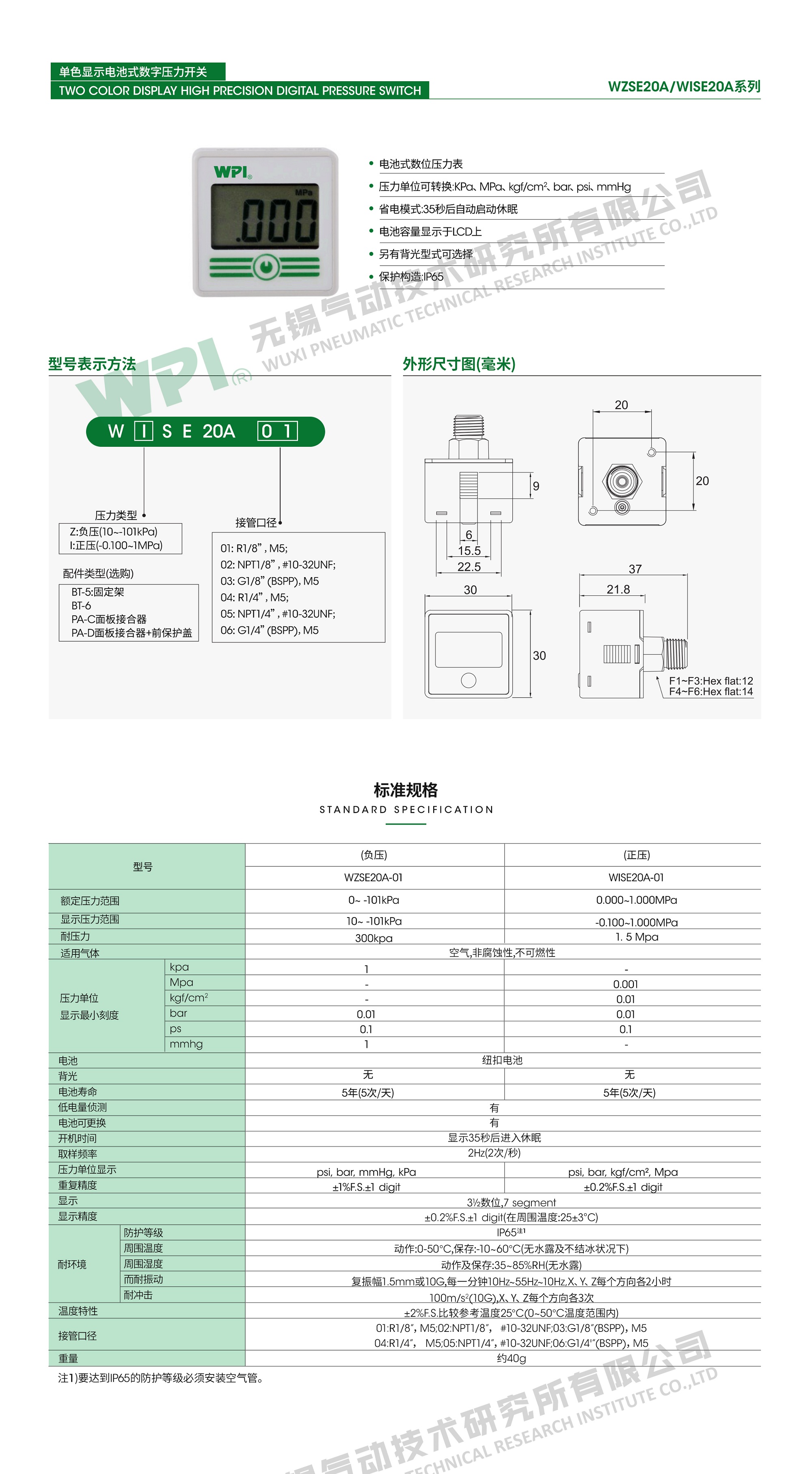 單色顯示W(wǎng)ZSE20A系列 電池式數(shù)字壓力開關(guān)
